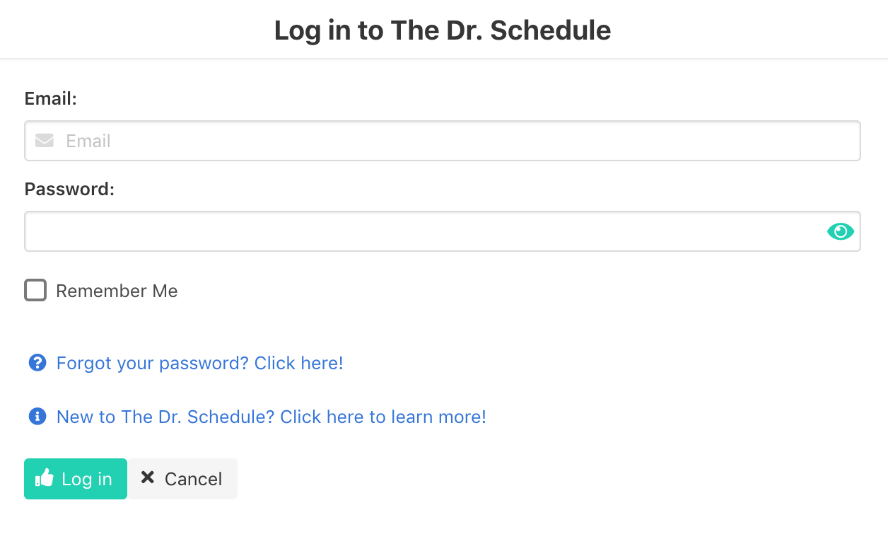For All Team Members: To log in, go to https://thedoctorschedule.com/login and enter your username (email address) and password (it will be the same password you used on the Admin Console or a temporary password that we emailed you.) If you forgot your password, just click the Forgot Password link and a new one will be emailed to you.