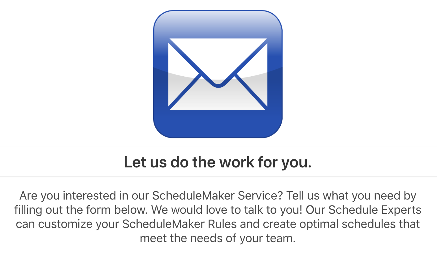 If you are tired of spending hours and hours manually creating schedules for your team, consider using our ScheduleMaker Service. From the Manage Team menu, select ScheduleMaker. Here you will find details about your team's custom created schedules, or send us a message if you are interested in signing up for this service. Our team will guide you through the process of approving/denying requests and then using computer algorithms to create a schedule that gives everyone an equal share of assignments while keeping customized ScheduleMaker Rules that you will set for your team (for instance, avoiding doing a certain Job two days in a row).