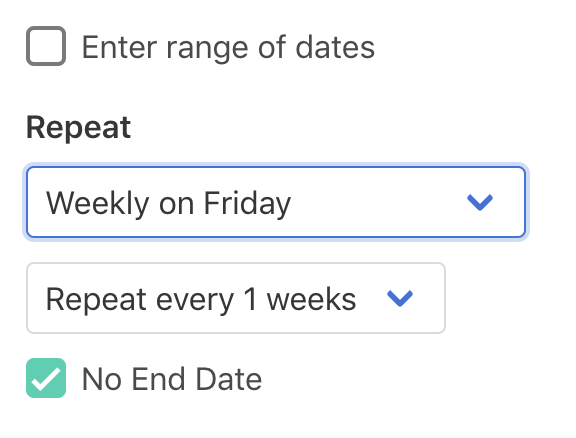 To make an item repeat every week or month, select one of the Repeat Options when adding the item to the calendar. You can specify an end date or click No End Date to have the item repeat indefinitely.
