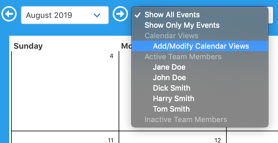 Calendar Views are a way to filter the calendar to display only the data that you would like to see. You can show only a particular Team Member's events, events for a certain set of Jobs, or events filtered by a combination of Team Member(s) and Job(s). You may click on Add/Modify Calendar Views (or choose Calendar Views from the Manage Team menu) to create customized filters.