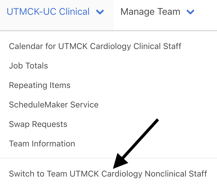 Team Managers and Administrators will receive an email when a swap request requires approval. You may access the swap requests for the team (as opposed to your personal swap requests) by selecting Swap Requests for Entire Team from the Manage Team menu.