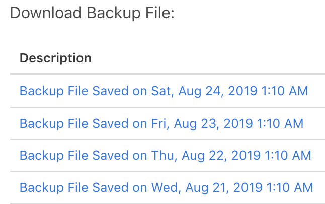 Choose Backups from the Manage Team menu to create backups of all of the items on your Team Calendar. To make a new Backup, choose Create New Backup. Please note that the total number of backups per team is limited and you may have delete an older backup to make room for a newer one. It will take a few minutes to complete the backup process, so you will have to click the Refresh button in your browser.